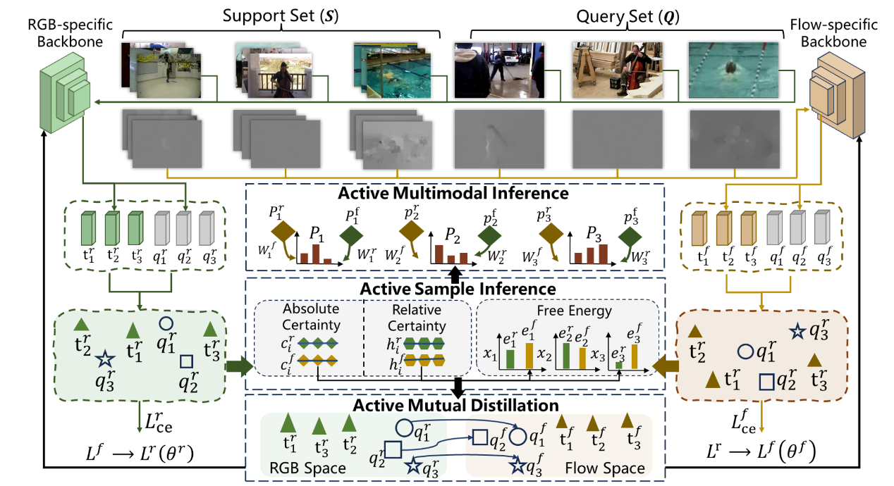 针对现有少样本动作识别方法主要依赖单一模态数据,在复杂动作上性能受限,对模态可靠性缺乏动态评估,论文提出了一种基于主动推理的多模态少样本动作识别框架,通过动态识别样本级可靠模态、双向知识蒸馏和自适应融合,显著提升了识别性能。所提出的模型首先通过一个主动样本推理模块,利用变分自由能动态评估并选择每个查询样本的最可靠模态;其次每一个样本会通过有一个主动互蒸馏模块,将可靠模态的任务知识双向迁移至不可靠模态以增强其表征;最后自适应多模态推理模块根据样本的模态置信度加权融合输出样本的检测结果。实验结果表明,所提出的模型在Kinetics-400、SSv2、HMDB51和UCF101四个数据集上,多模态信息的利用效率和识别精度,显著超越STRM、TRX、AFMAR等方法。