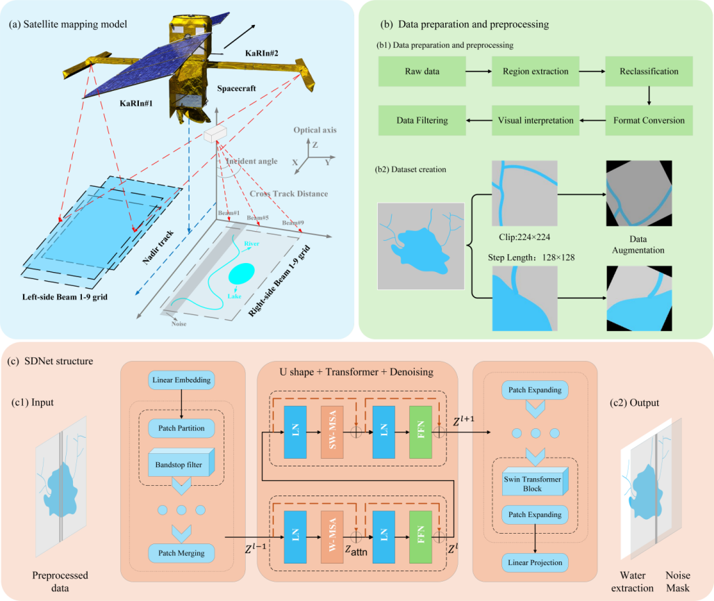 京津冀生态文明发展研究院教师么嘉棋副研究员在卫星地表水立体监测研究中取得重要进展,围绕SWOT卫星内陆水体提取中存在的噪声干扰与质量控制不稳定问题,提出了多尺度去噪与质量控制优化一体化框架,为提升新一代测高卫星数据在复杂水体环境中的应用精度提供了关键技术支撑。相关研究成果以“SDNet: A Multi-Scale SWOT Framework for Denoising and Quality-Control Optimization in Inland Water Body Extraction”为题,发表于GIScience & Remote Sensing。