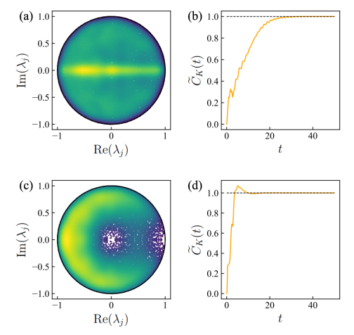 图1 长程耦合驱动体系由可积走向混沌的典型判据。左侧四个子图展示了厄米与非厄米情形下的谱统计与Krylov complexity特征。